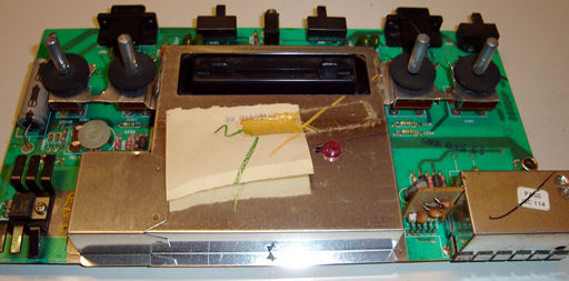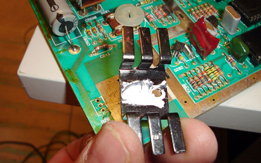 että hohhoijaa... Ja sitten se regulaattori. Ruuvataan irti ja poistetaan vanha regulaattori juotoksistaan tinaimusukkaa apuna käyttäen. Varo riuhtomasta ettei foliot lähde mukana. Uutta asennettaessa käytetään regulaattorin ja jäähdytyselementin välissä lämmönjohtotahnaa. Sitä voi sipaista myös tuon elementin alle kuten itse tein.