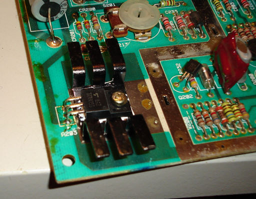 että hohhoijaa... Ja sitten se regulaattori. Ruuvataan irti ja poistetaan vanha regulaattori juotoksistaan tinaimusukkaa apuna käyttäen. Varo riuhtomasta ettei foliot lähde mukana. Uutta asennettaessa käytetään regulaattorin ja jäähdytyselementin välissä lämmönjohtotahnaa. Sitä voi sipaista myös tuon elementin alle kuten itse tein.