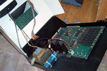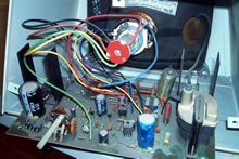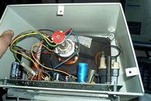Tässä on juovamuuntajan yksi jalka murtunut juotoksestaan.
