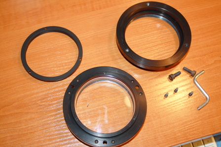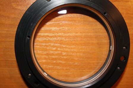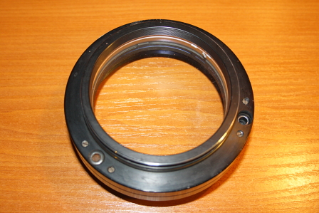 että klap! Jossain vaiheessa on tämän jousirenkaan ruuvit vedetty pohjaan asti. Sitten on ulkoapain painettu linssiä vasten niin kovaa, että koko linssipari on liikkunut taaksepäin, ja tämä kolmesta kohtaa linssiä paikallaan pitävä jousisysteemi on painunut ruttuun. Tämän renkaan tarkoituksena on että linssiä ei puristeta liian kovalla voimalla. Varsin hieno systeemi, kun on otettu huomioon purisuksen aiheuttama taipuma linssiin.. Linssin ulkoreunat suorastaan huutavat mustaa tussia. Voi olla turhaa hifistelyä mustata ne hajavalon heijastelun vähentämiseksi. Lyijykynällä tekemäni kohdistusmerkit eroittuvat. Kasaaan linssipaketin aina samoin kun olen sen purkanut. |