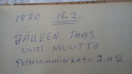 auki olevaan kuvaan. Se oli julkisivukuva kerrostalosta kansiossa "Kotitalot". Vanhojen, hapartuvien paperivalokuva-albumien skannailu ja digitoitujen kuvien organisointi oli mummilla taas menossa. Tällä kertaa projektina paikat missä on joskus asuttu, ja miltä ne näyttävät nyt. "Hei toi on se flipperipaikka!" sanoo tytär, ja siitä se ihmettely alkaa. Että mitä hittoa. Juurihan me oltiin tuossa pihassa kesällä. Miksi se on tällä työpöydällä? En ole edes kertonut flipperin ostosta sen tarkemmin, kuin että tytär oli mukana. Se oli kieltämättä eriskummallinen ostosreisu. |